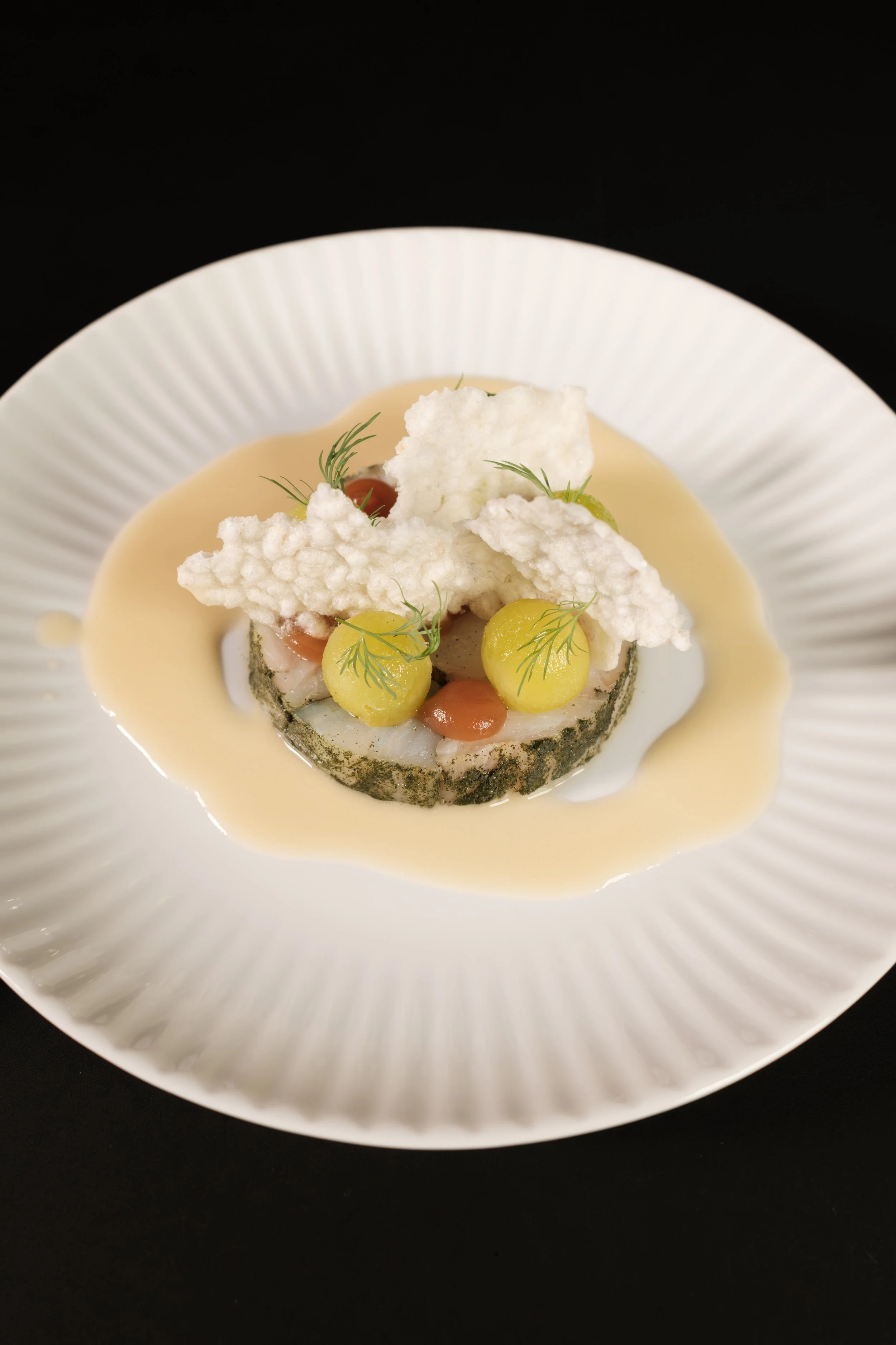 Mosaik af fløjlsblød torsk, serveret med karamelliseret æblepuré, syrlige skiver af frisk æble infuseret med intens dildolie, sprøde flager af rischips, toppet med frisk dild og en cremet champagne beurre blanc.