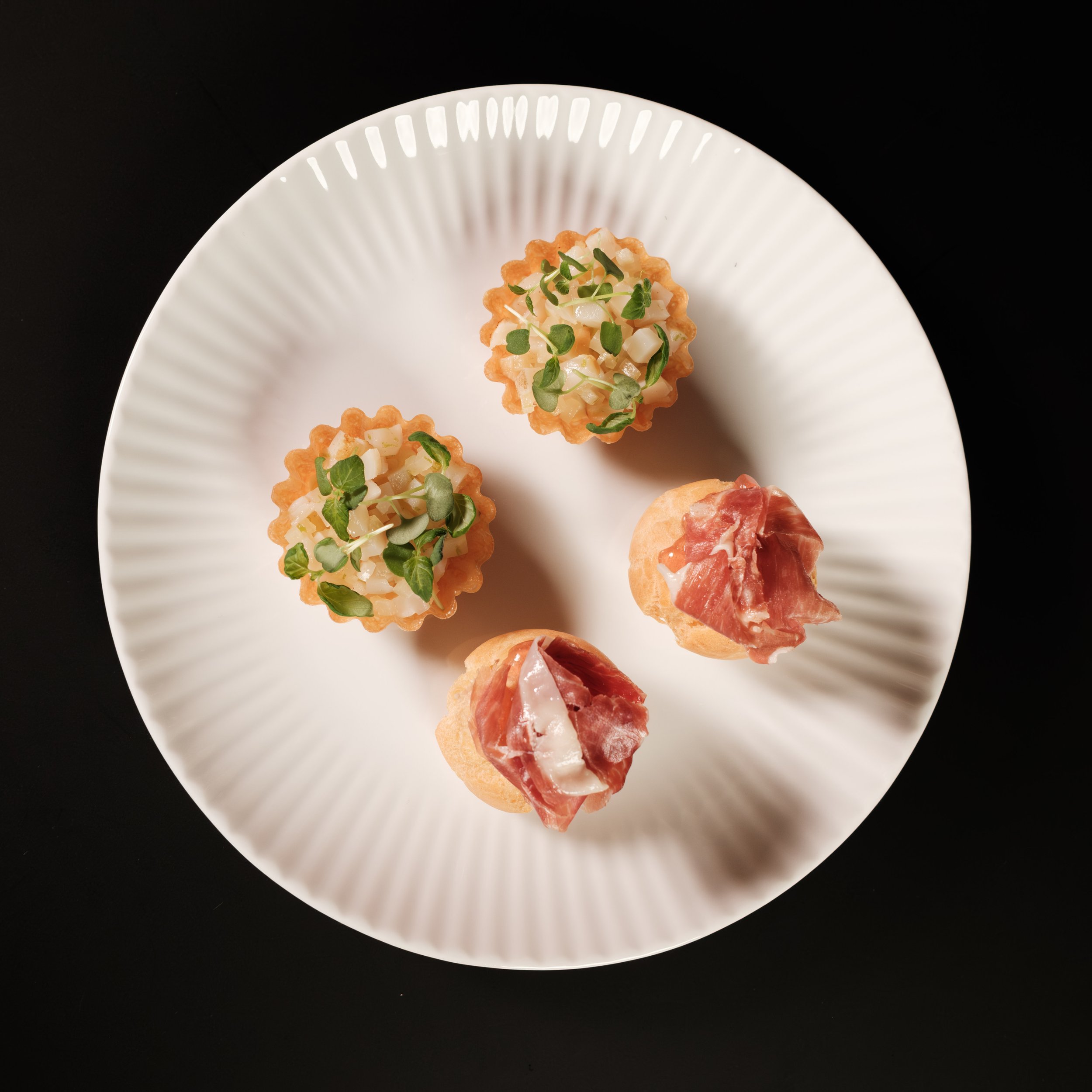 Lune, lette choux med cremet røget Vesterhavsost, toppet med pirrende sherrygelé og en silke tynd skive af 36 måneder modnet sortfodsskinke.