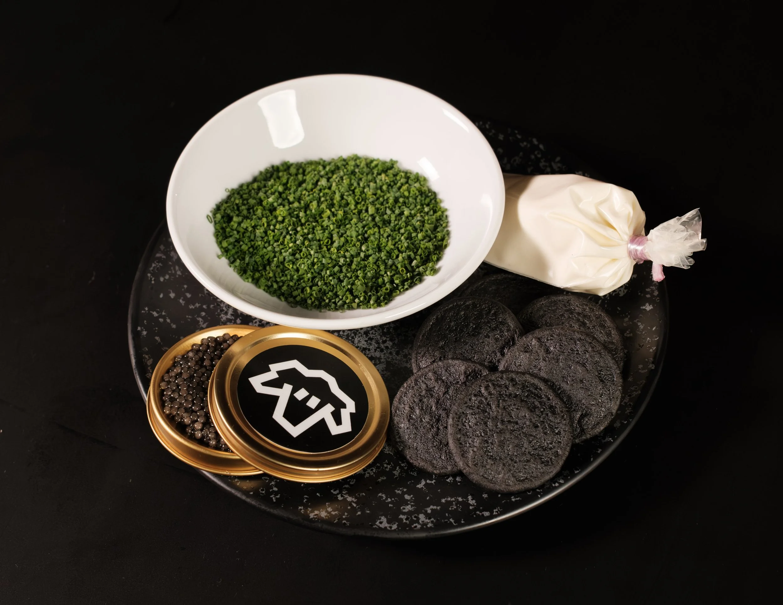 Gold kaviar med sorte blinis, luftig creme fraiche og finthakket purløg